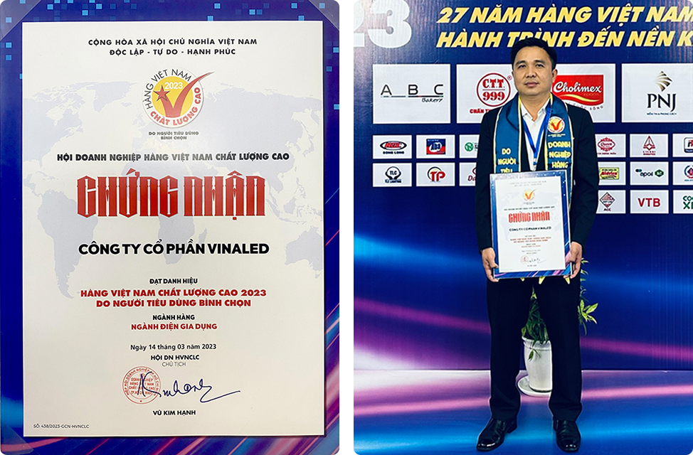 Công ty cổ phần VINALED vô cùng vinh dự khi được người tiêu dùng bình chọn là Hàng Việt Nam Chất Lượng Cao năm 2023.