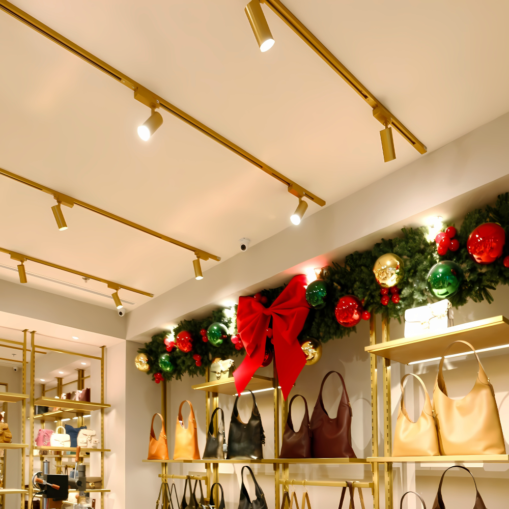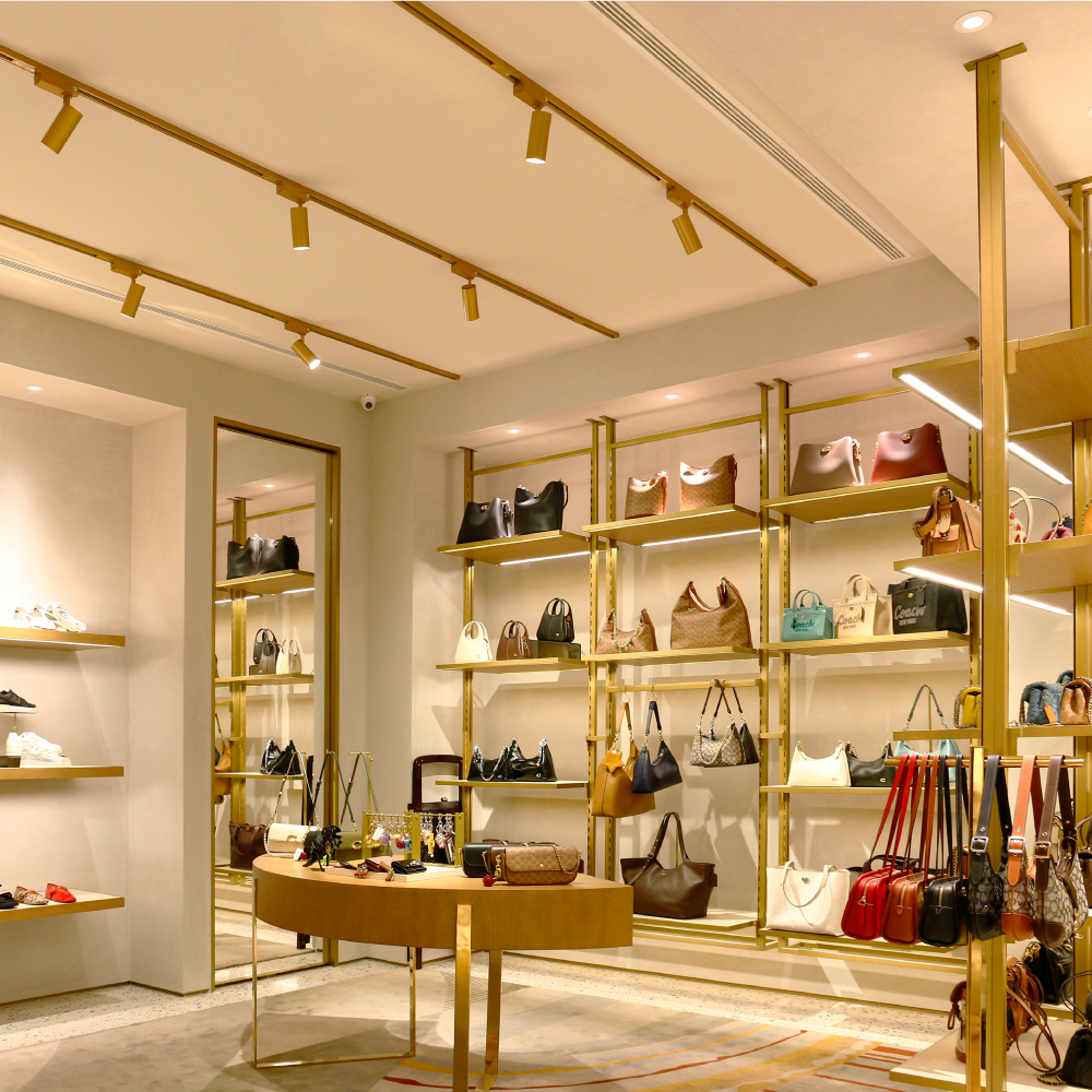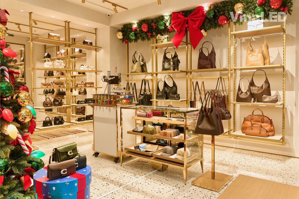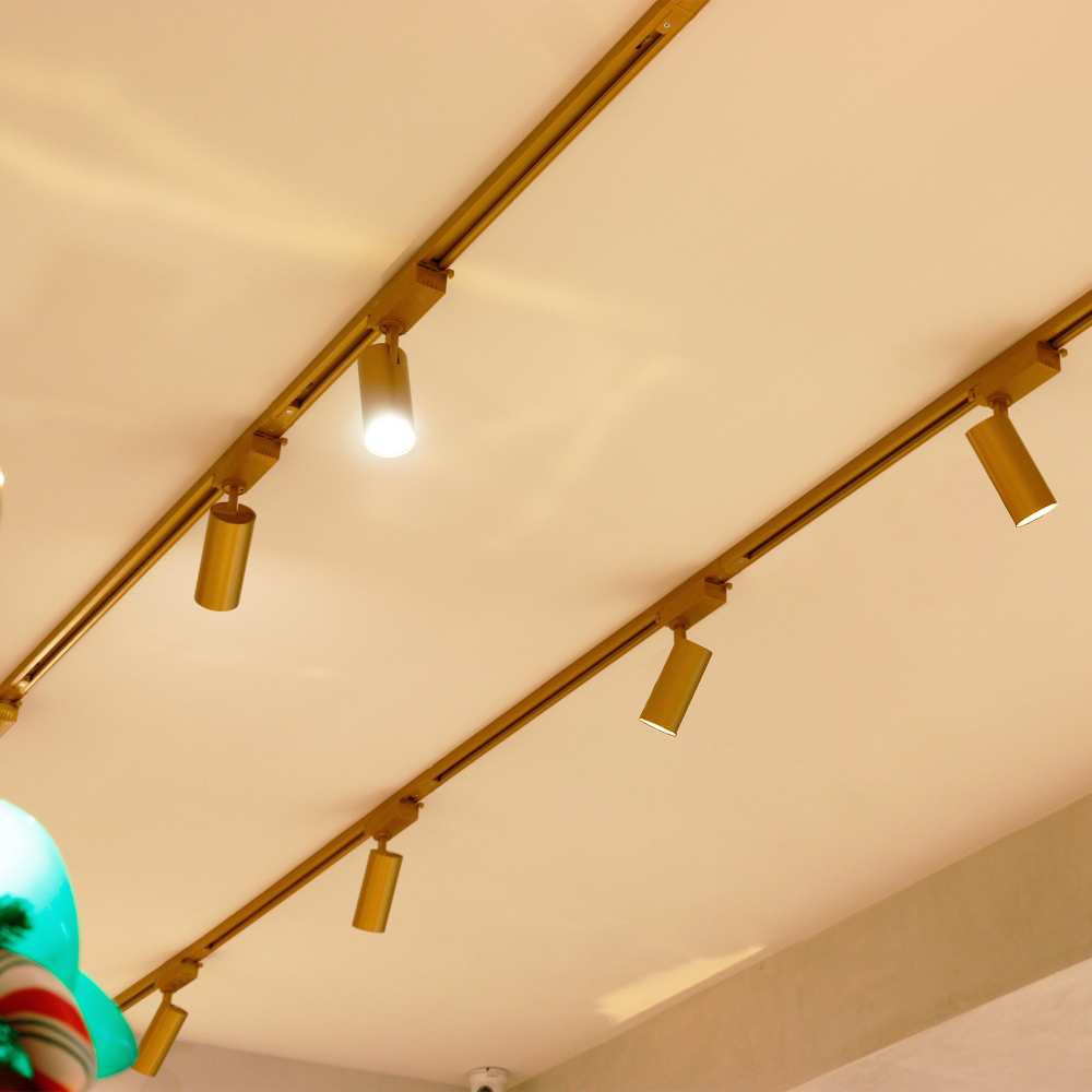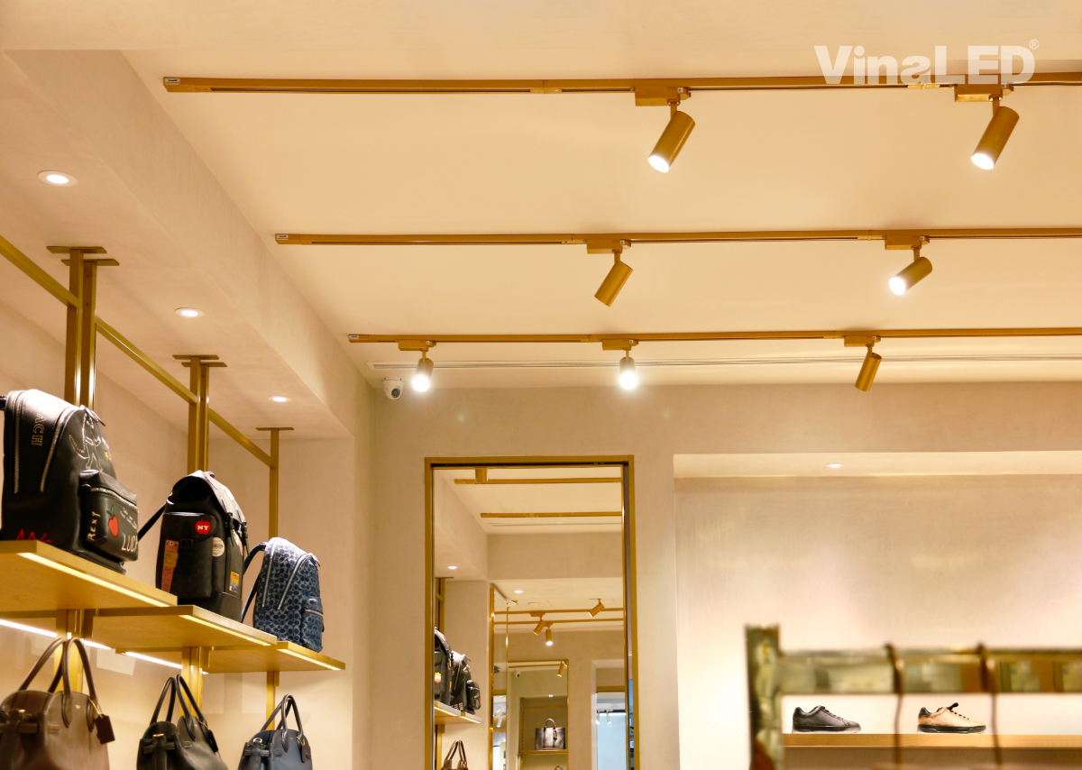 Không gian cửa hàng ngập tràn ánh sáng tinh tế và đầy cảm hứng nhờ hệ thống đèn rọi ray & phụ kiện thanh ray, được sơn phủ màu vàng đồng ấn tượng, cùng đèn âm trần chất lượng của VINALED.